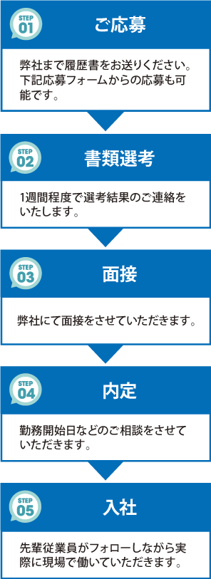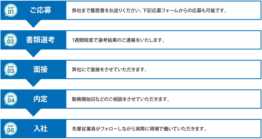 | 就業時間 | 8:00~17:00 ※現場により8:30~17:30など若干の変更があります ※現場の進捗により早出、残業もあります |